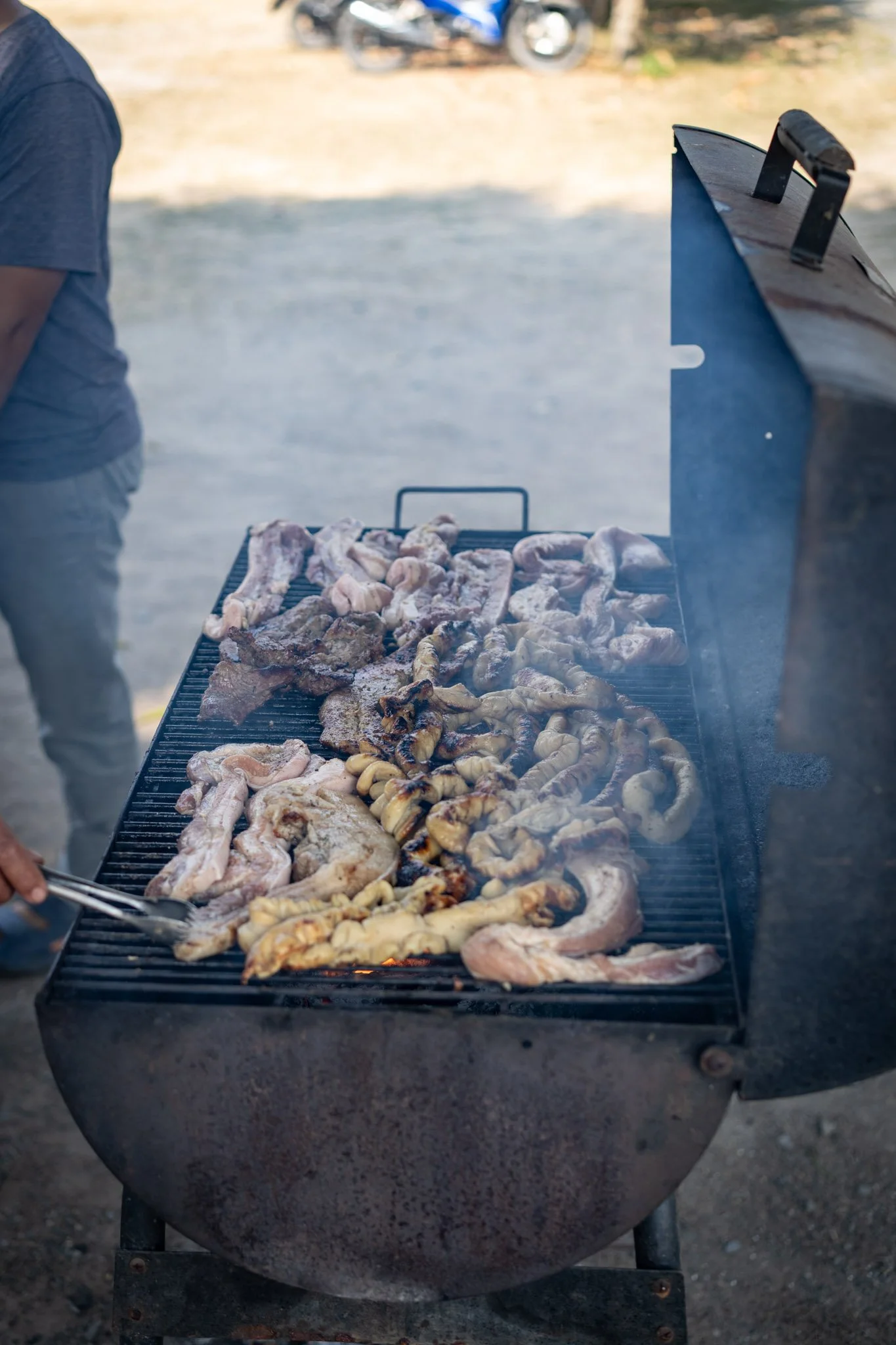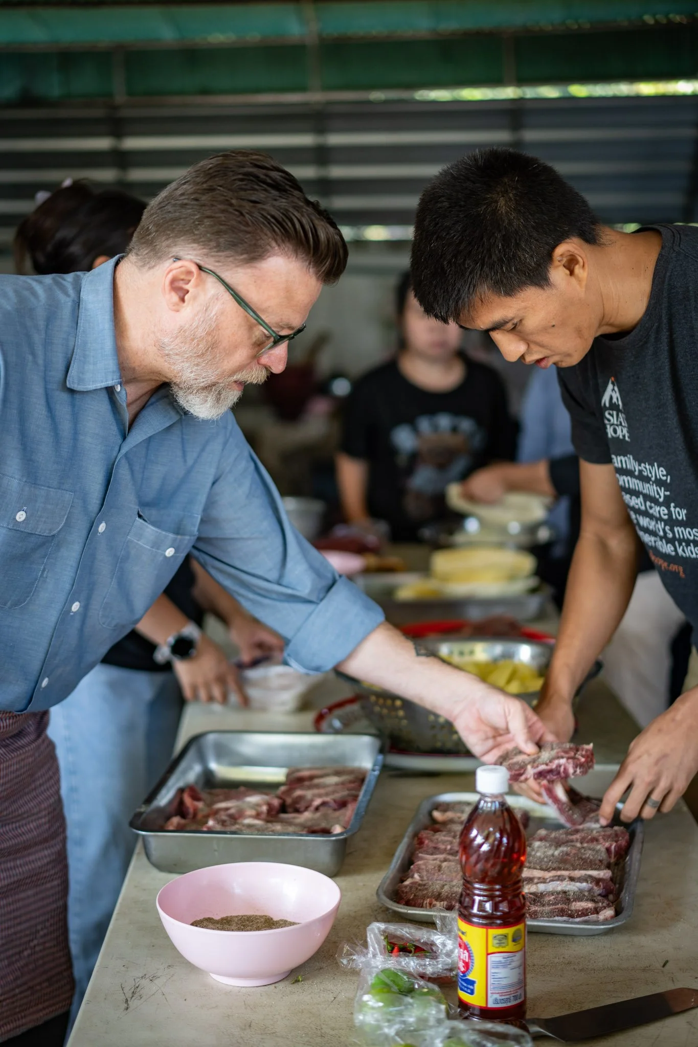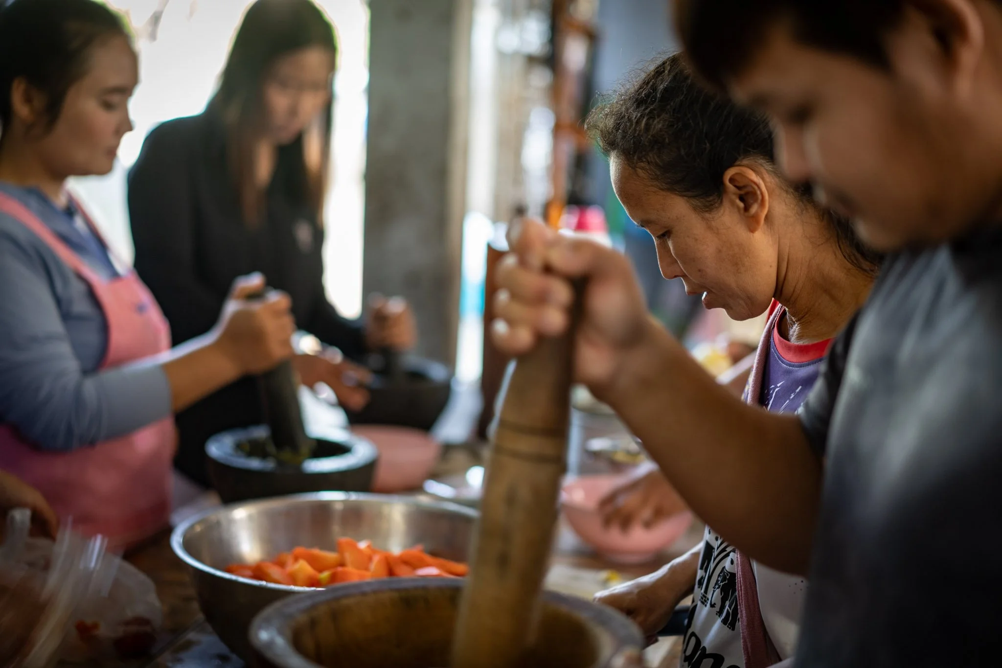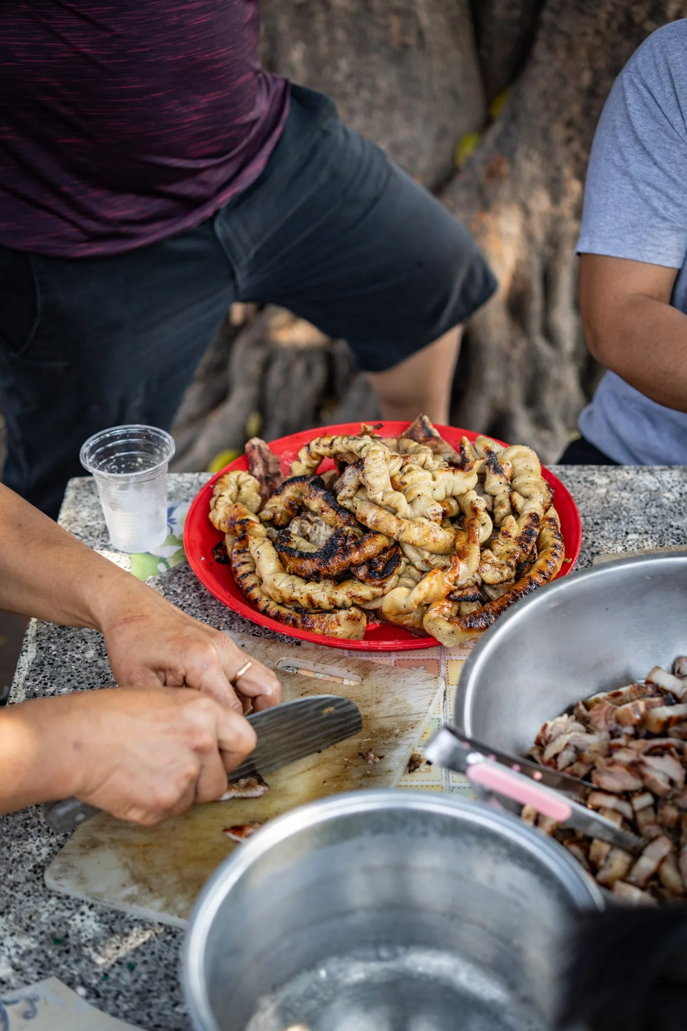 Over the next few hours, we set about the work of meal prep in earnest. The staff made a delicious, very spicy papaya salad and marinated about ten pounds of pork belly and intestines in garlic, ginger, and fish sauce. I seasoned the mostly thawed meat with a simple mix of salt and pepper and set my team of assistants to a variety of tasks. At one point, we had three mortars going and four people working the cutting boards.
