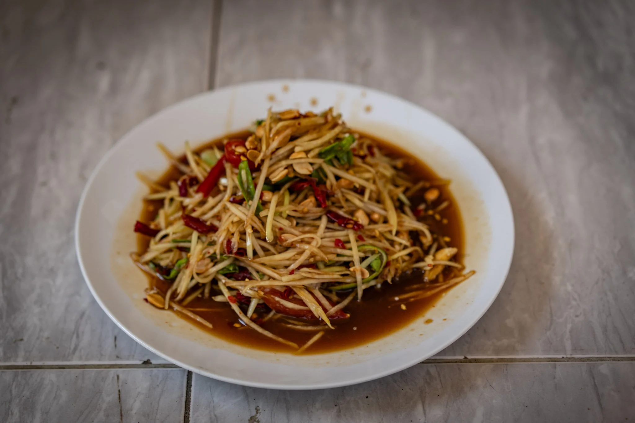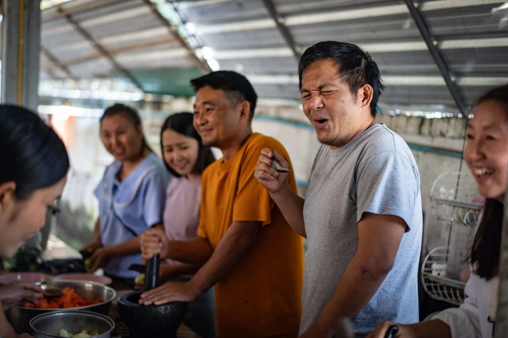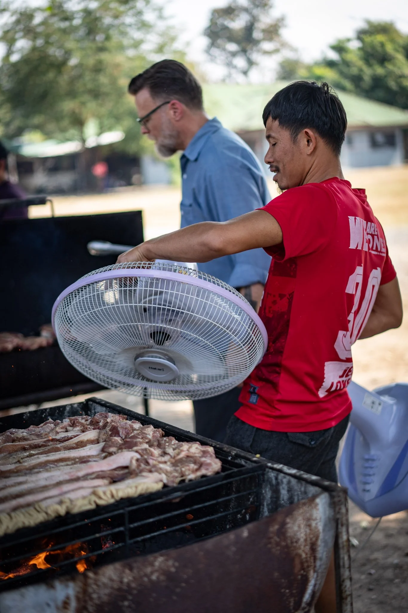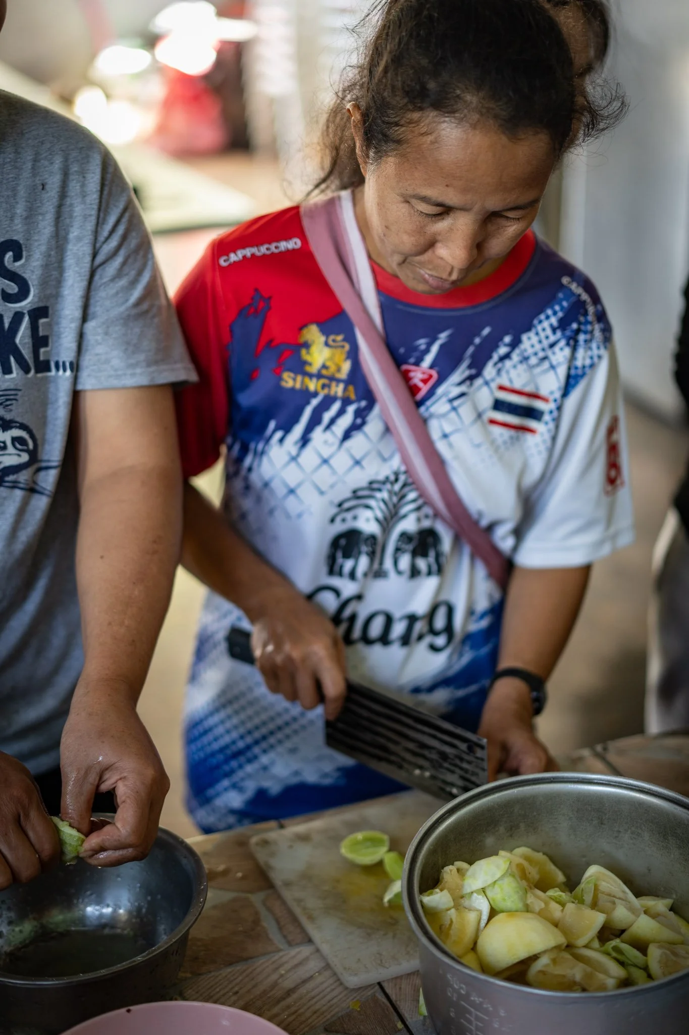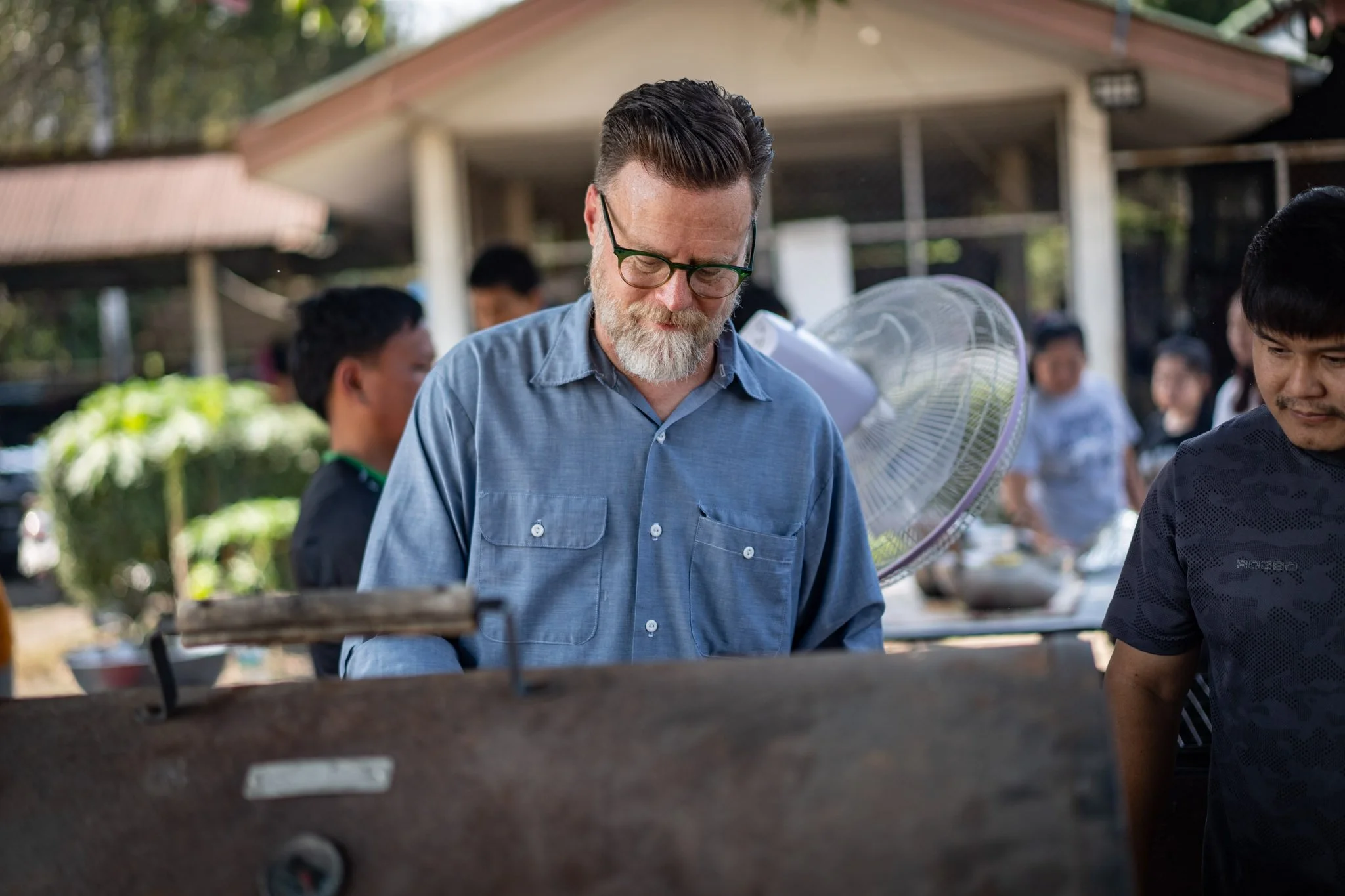 Over the next few hours, we set about the work of meal prep in earnest. The staff made a delicious, very spicy papaya salad and marinated about ten pounds of pork belly and intestines in garlic, ginger, and fish sauce. I seasoned the mostly thawed meat with a simple mix of salt and pepper and set my team of assistants to a variety of tasks. At one point, we had three mortars going and four people working the cutting boards.