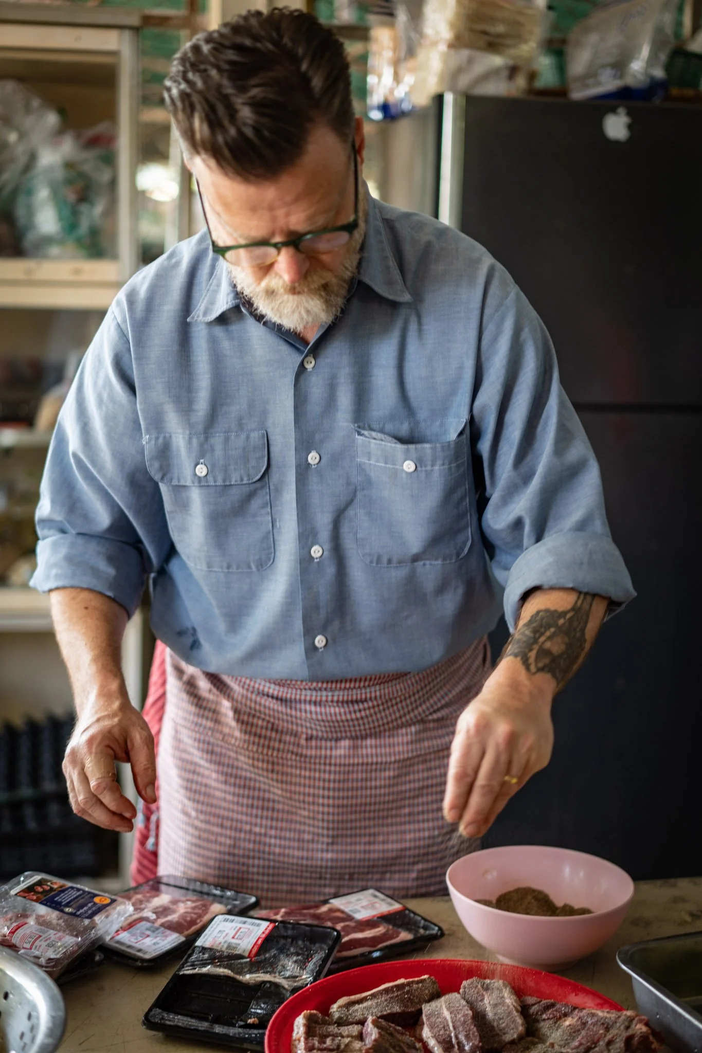 That’s when I noticed a large butcher’s counter with a much better selection. I found some nice-looking rib filets that weren’t frozen and were only slightly more expensive than the sirloin.