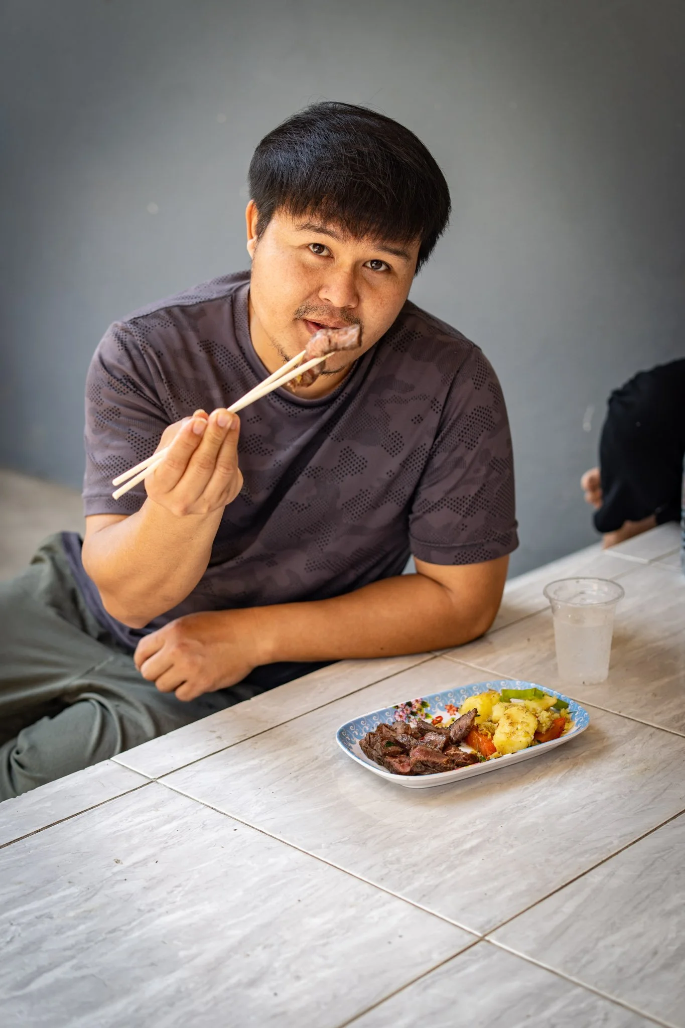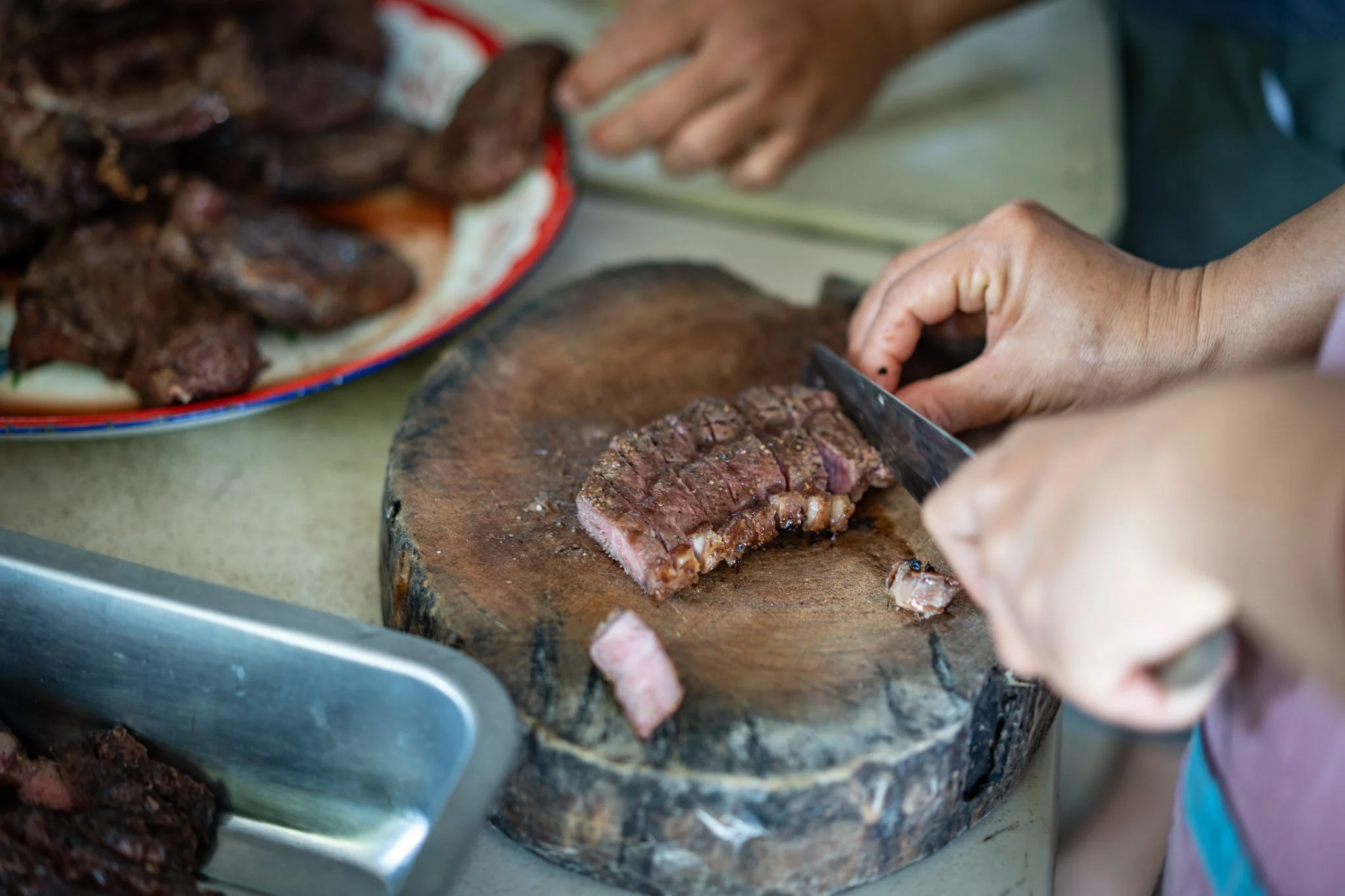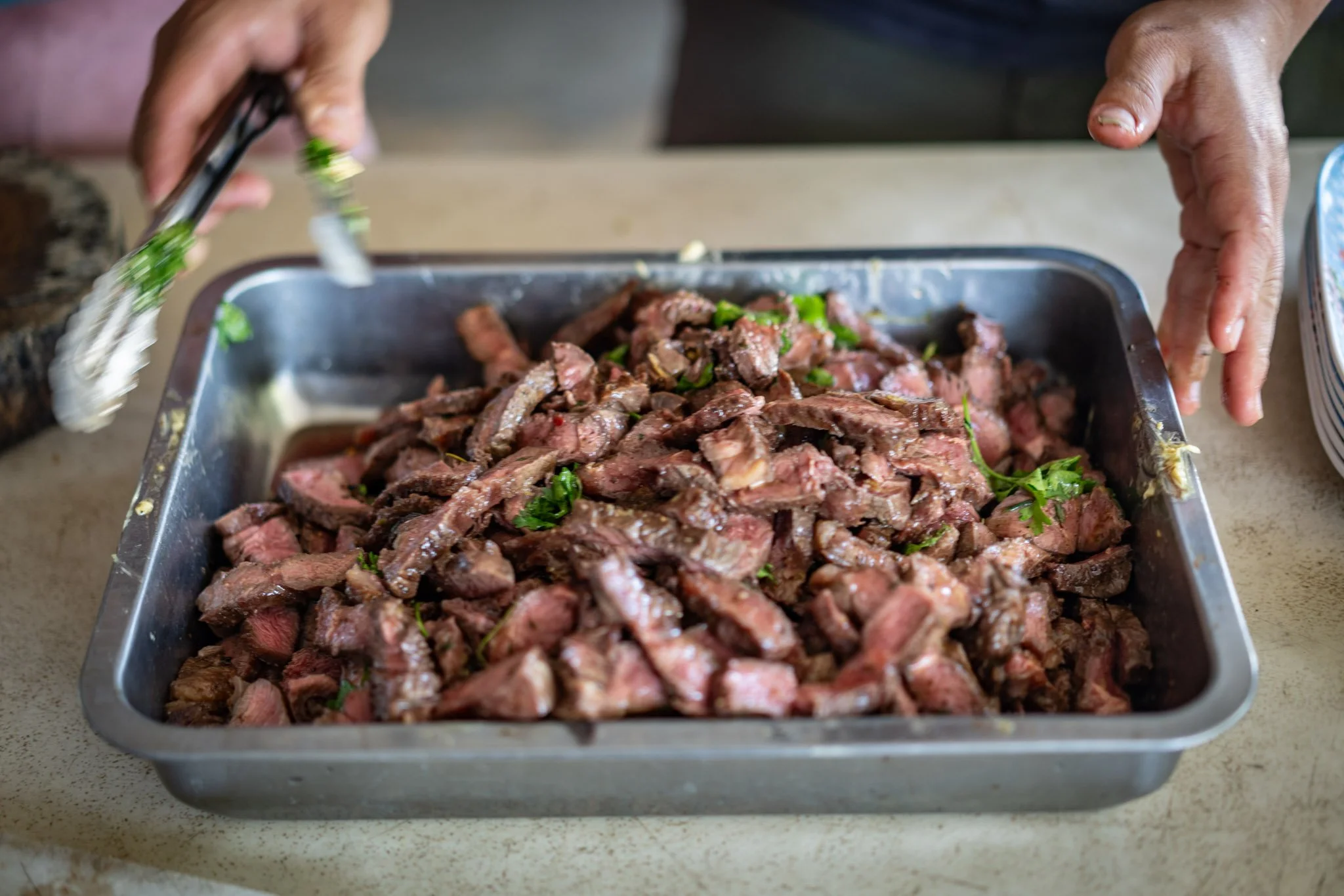 I quickly overcame a brief spasm of irritation, set the meat out in the bright sunlight to thaw, and began prep. Our staff looked with concern at the relatively small amount of meat and decided to add a few dishes of their own to the menu. They asked how much the steak had cost, and when I told them, one of them said, “Next time we will buy a whole cow. Cheaper.”
