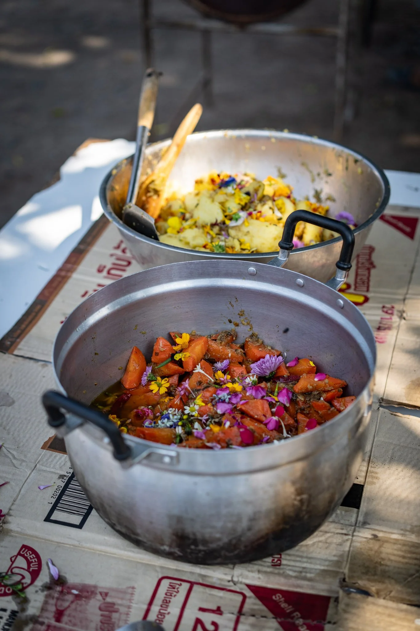 After Makro, we stopped at a more traditional local green market. I bought one vendor’s entire stock of carrots and picked up cilantro, green onions, limes, garlic, fish sauce, chilies — and a decent selection of whatever else I thought might come in handy. I knew Tutu had a nice bottle of organic honey at home and figured I could come by sugar and salt without much trouble.